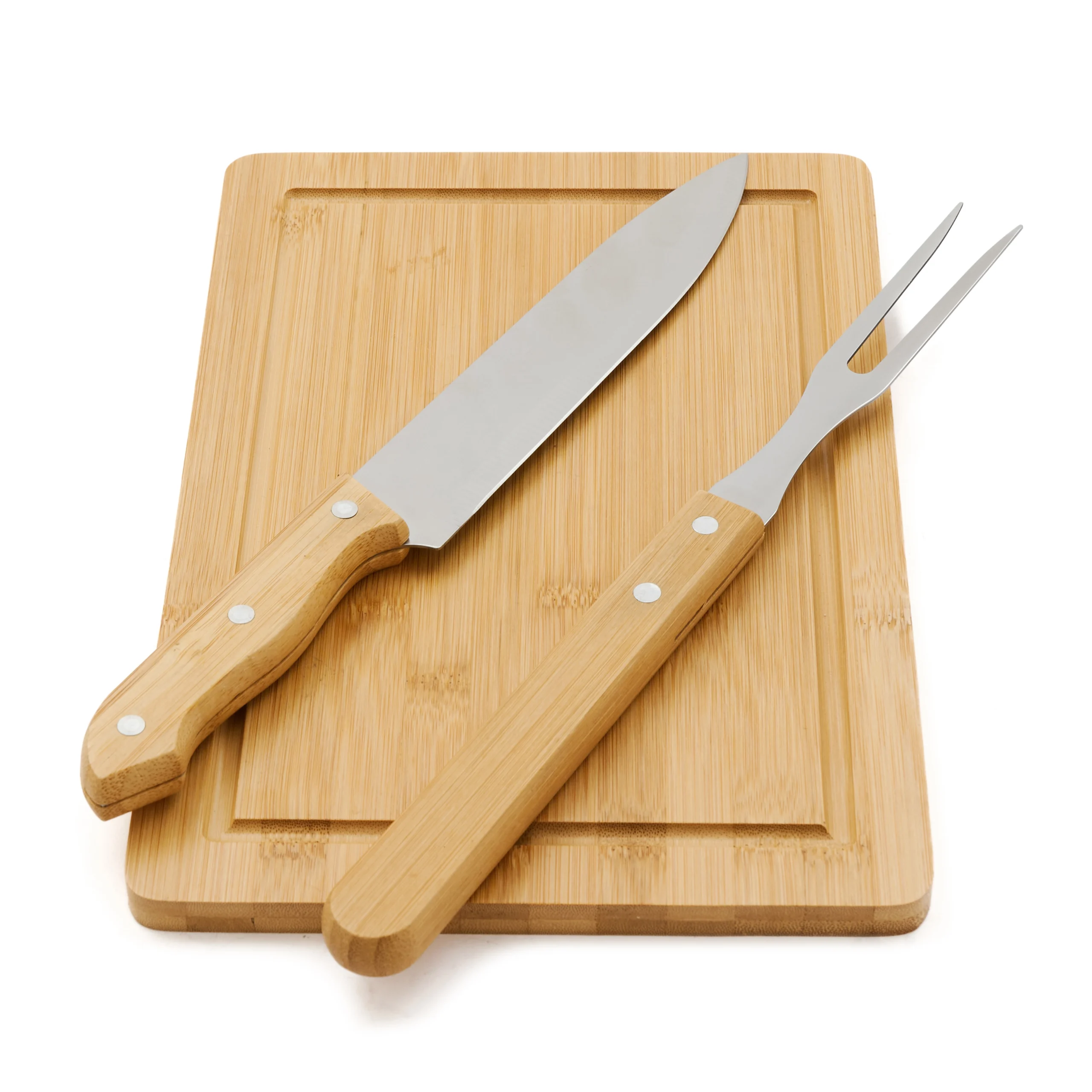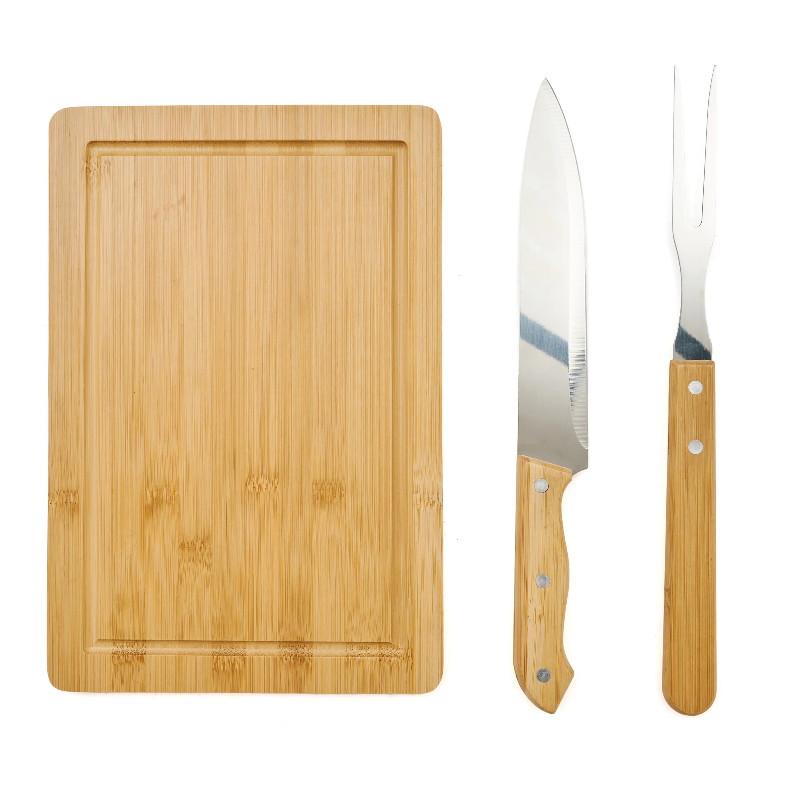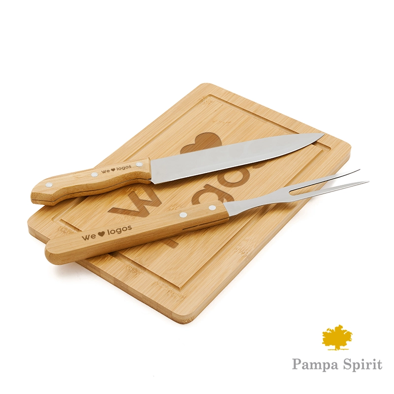 El set de asado Roti contiene: tenedor y cuchillo de 33 cm, ambos con mango de madera y, tabla de bamboo de 30 x 20 x 1,2 cm. Este set incluye todo lo que necesitas, ideal para los amantes del asado.